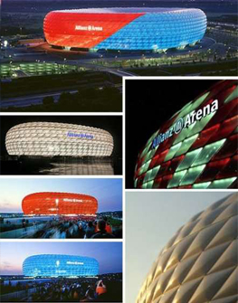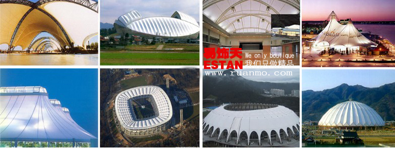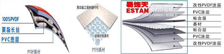 ETFE(EthyleneTetraFluoEthylene)沒有布基,是一種顆粒狀結(jié)晶體的薄膜。一般做成雙層或三層充氣結(jié)構(gòu),厚度12~500um;透光率在95%以上;強度一般在30~60N/mm2之間;耐火等級B1級。