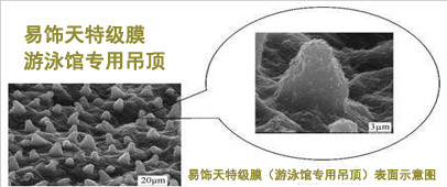 北京易飾天軟膜拉蓬技術有限公司針對室內游泳館吊頂防氯氣腐蝕、防結露、耐高溫、耐寒冷低溫、絕緣、使用壽命長等各種技術有求,于2006年初和國內有關研發部門共同研究試驗開發下,在雙方研發人員的共同努力下,終于研發制造出適用于游泳館吊頂專用材料‘特級膜’,本材料是有納米聚碳氯乙烯材料和其它高科技納米材料制成,經過10多道的制作工藝和高科技處理;本產品使用于室內相對濕度較大空間內,有一定的防結露、保溫、防氯氣腐蝕、等功能,安裝后如同高級潛水服一樣有效的減少水和空氣的阻力。有完全的防水、防潮、防霉,絕緣功能,具有很好的保溫隔熱性能。保證室內溫度不流失、頂部不結露。具有耐高溫(100°)和耐寒冷(-40°)特性,適用于地球上各種惡劣環境,使用壽命在15年以上。